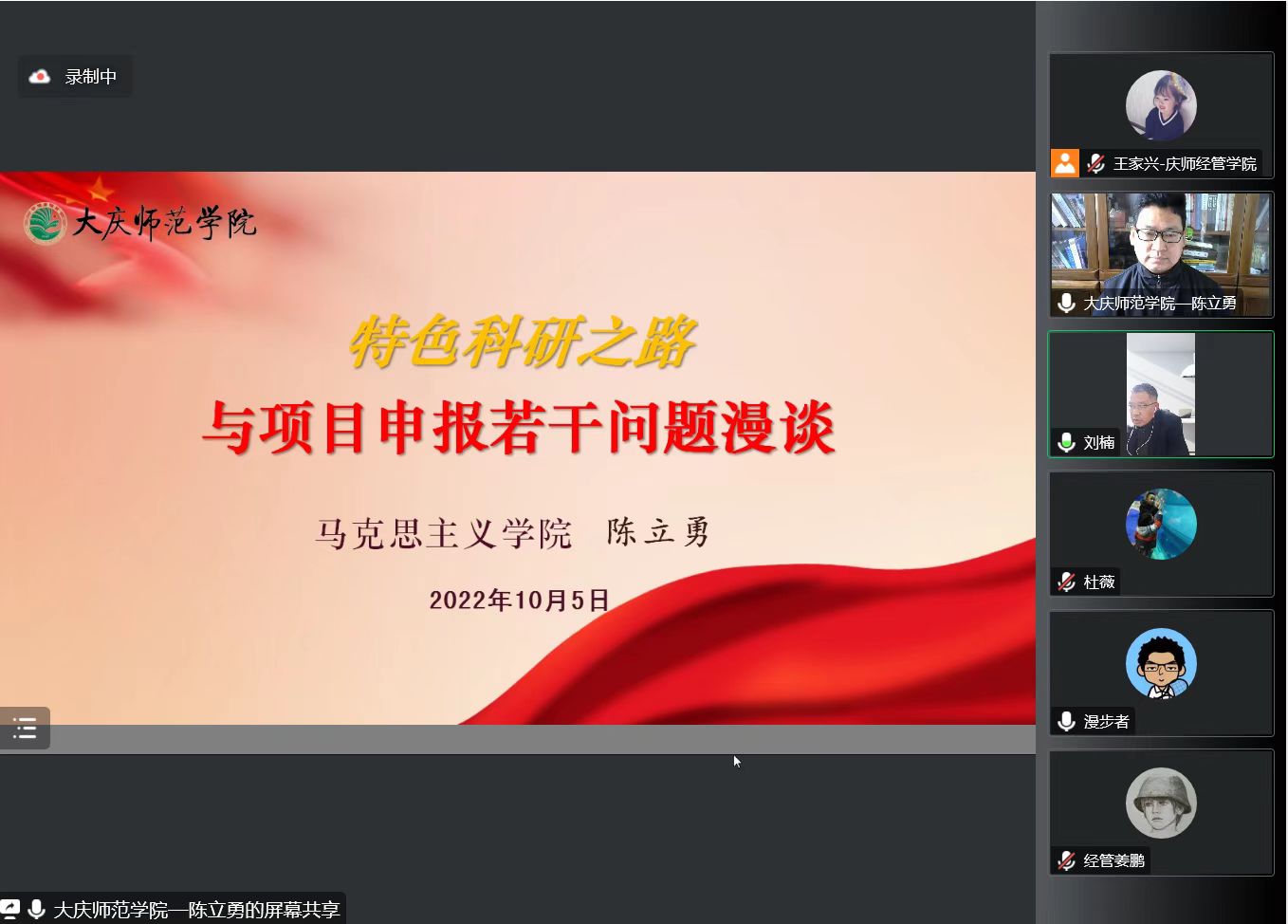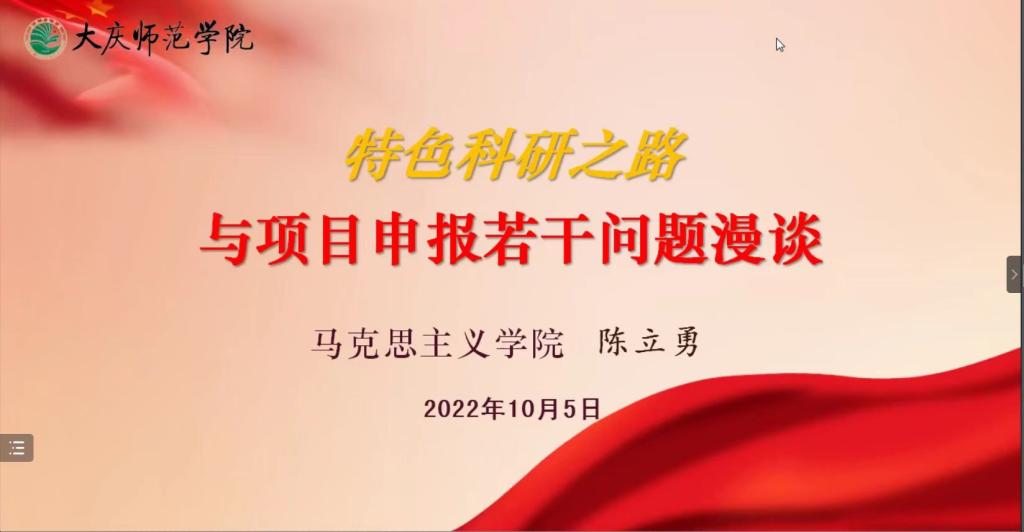 10月5日下午,黑龙江省哲学社会科学大庆精神研究基地副主任、大庆精神与龙江西部经济社会发展研究中心研究员、kaiyun开云官方网站马克思主义学院陈立勇副教授受邀做了题为《特色科研之路与项目申报若干问题漫谈》的专题讲座。讲座采用线上腾讯会议形式,由kaiyun开云官方网站行政负责人刘楠教授主持,部分文科学院院长、科研副院长、教师以及经管学院全体教师等100余人参会。