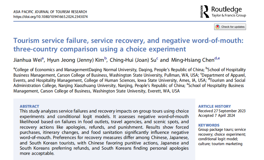近日,我院韦健华博士与华盛顿州立大学陈明祥教授团队合作,以第一作者,kaiyun开云官方网站为第一单位,在SSCI检索期刊《Asia Pacific Journal of Tourism Research》,发表论文《Tourism service failure, service recovery, and negative word-of-mouth: three-country comparison using a choice experiment》。该期刊目前在中科院SCI检索分区中处于旅游、休闲、体育研究领域的三区。
