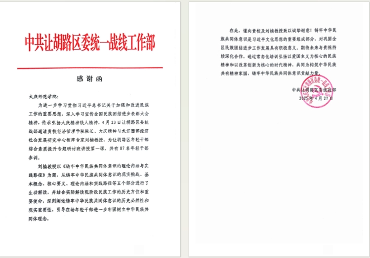 日前,大庆市大庆市让胡路区委统一战线工作部向kaiyun开云官方网站发来感谢信,对kaiyun开云官方网站院长、大庆精神与龙江西部经济社会发展研究中心智库专家刘楠教授予以高度评价。对其以《筑牢中华民族共同体意识的理论内涵与实践路径》为题的精彩授课表达诚挚谢意,此次授课为让胡路区民族工作注入新的活力与思路。