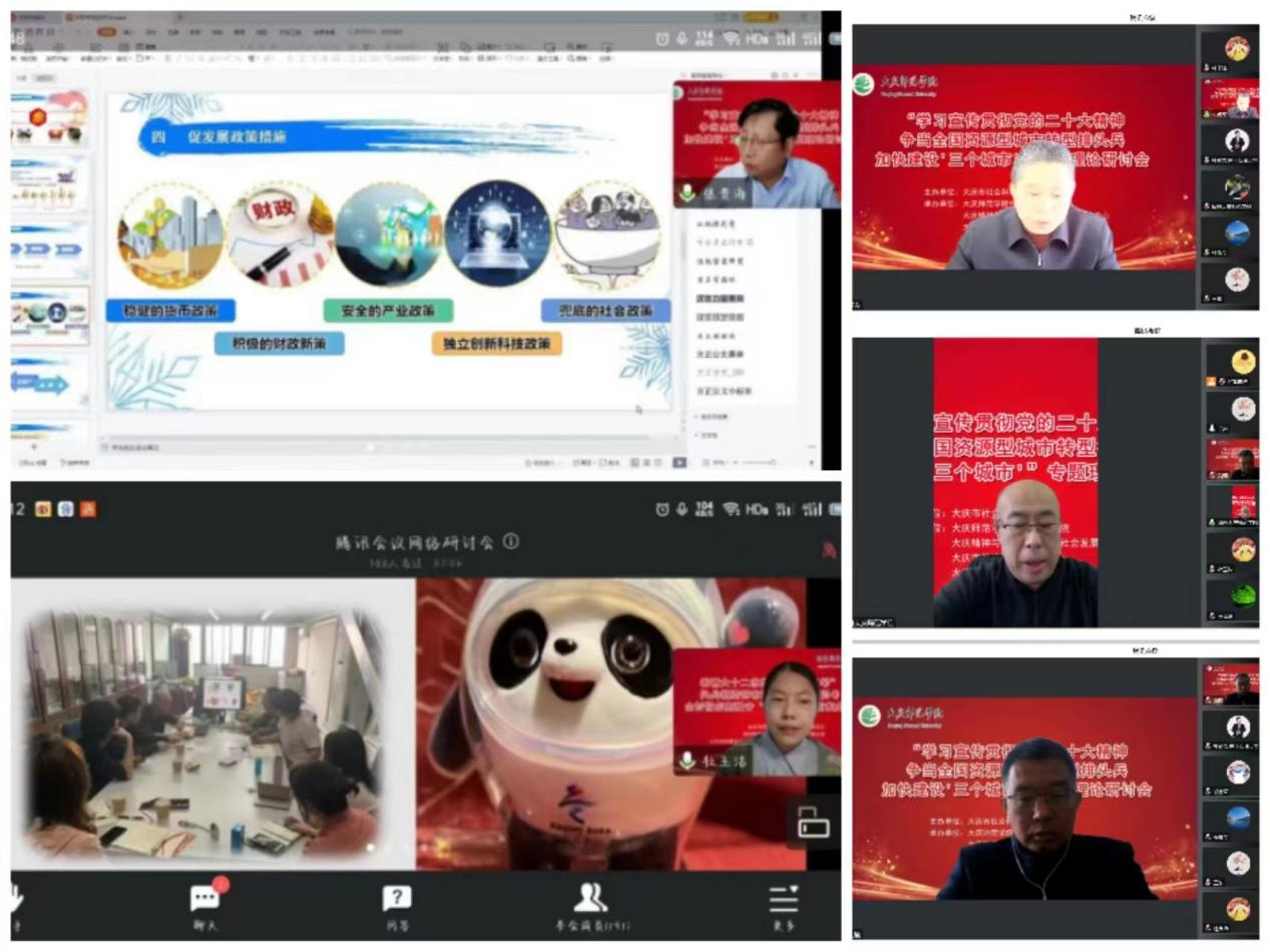 2022年12月23日,由大庆市社会科学界联合会主办,kaiyun开云官方网站、大庆精神与龙江西部经济社会发展研究中心、大庆市经济学会、大庆市新时代文明实践与乡村振兴研究会联合承办的主题为“学习宣传贯彻党的二十大精神争当全国资源型城市转型排头兵加快建设‘三个城市’”专题理论研讨会于线上召开。来自于大庆市社会科学界联合会、各县区、kaiyun开云官方网站、其他驻庆高校、各学会协会会员、学生代表等,共计近300人参加了此次会议。会议由kaiyun开云官方网站行政负责人刘楠教授主持。