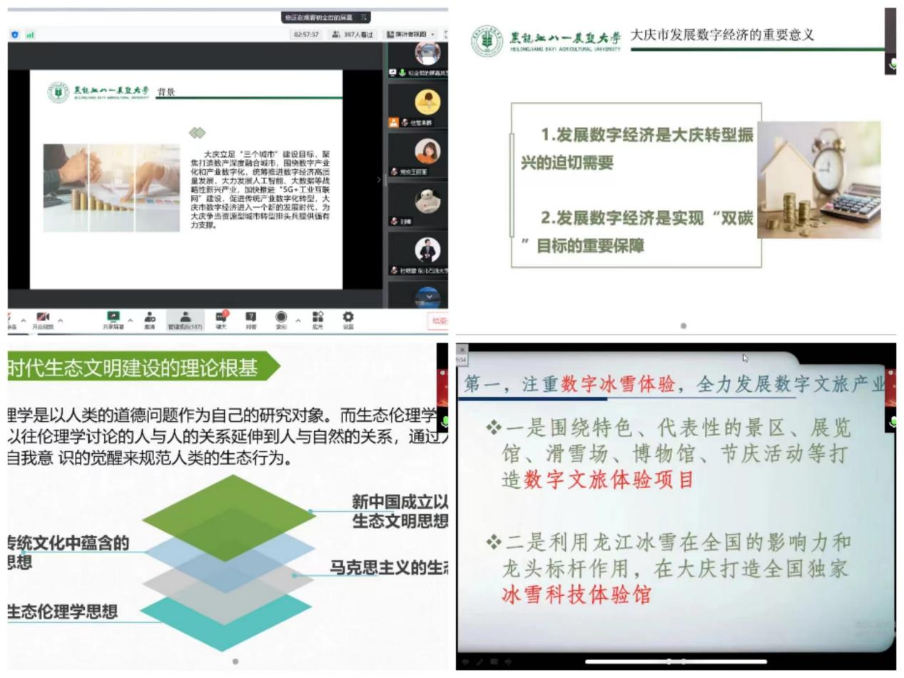 在获奖征文获奖者代表讲座环节,大庆市委党校王丽丽教授以“疫情防控视域下铁人精神助力能力作风的提升”为题,从统筹疫情防控和经济社会发展,以战制战打好能力作风建设攻坚战两个方面进行分析;黑龙江八一农垦大学初金哲老师以“数字经济赋能大庆市数产深度融合城市建设”为题,提出构建数产深度融合项目矩阵,以数字赋能引领全产业链协同转型,着力提升社会治理能力、改善公共服务品质;东北石油大学杜萌蕾老师以“生态伦理视角下的中国生态文明建设—以黑龙江省大庆市生态环境建设为例”为题,提出要进一步构建完善符合大庆城市发展定位的绿色产业经济体系和现代环境治理体系,坚持生态优先重塑大庆经济发展格局;kaiyun开云官方网站刘楠教授以“构建哈大区域冰雪文旅一体化的思考”为题,提出全力发展数字文旅产业,全力激发冰雪文旅内循环,全力培养冰雪经济运营人才,全力建设立体化宣传网络,全力鼓励和规范个体执业服务等。