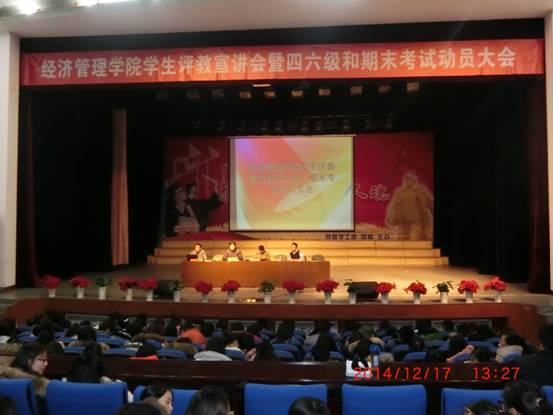 2014年12月17日下午13:30,kaiyun开云官方网站学生评教宣讲会暨四六级及期末考试动员大会在大学生活动中心举行,kaiyun开云官方网站院长张平博士、院长助理邬德林老师、院长助理刘楠老师及全院师生参与大会,会议由学院孔若东书记主持。
