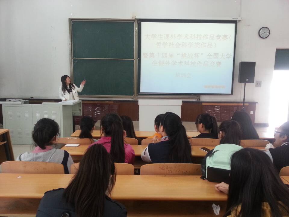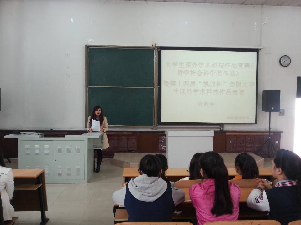 为迎战2015年第十四届“挑战杯”全国大学生课外学术科技作品竞赛(哲学社会科学类作品竞赛),提高广大学生创新意识,增强科研能力,营造校园实践创新文化氛围,充分做好大赛赛前准备工作,kaiyun开云官方网站实践教学中心广泛宣传、积极动员,于2015年4月16日在第五教学楼阶梯教室,组织召开了“kaiyun开云官方网站2015年大学生课外学术科技作品竞赛(哲学社会科学类作品竞赛)暨第十四届‘挑战杯’全国大学生课外学术科技作品竞赛校内选拔赛”赛前培训与动员大会。2013级、2014级市场营销专业、旅游管理专业、财务管理专业欲参赛同学参加了此次大会,培训会由kaiyun开云官方网站实践教学中心主任于珊珊老师主持。