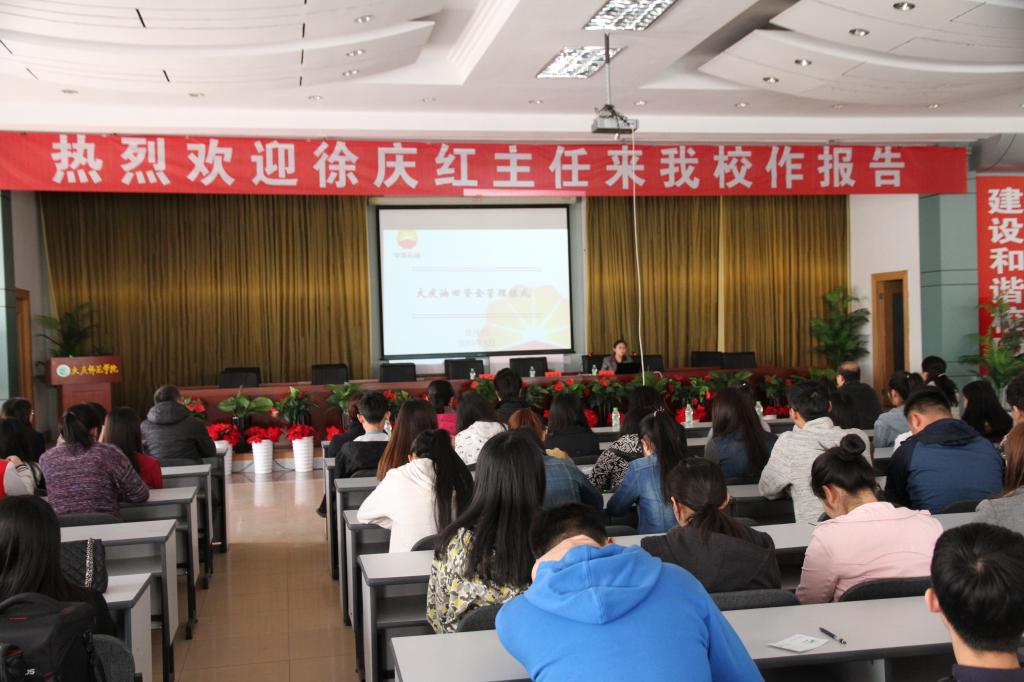 聘任仪式后,徐庆红副主任为财务管理专业学生作了题为《大庆油田资金管理模式》的讲座。在讲座中徐主任向学生讲解了资金集中管理的优缺点、应遵循的原则、思路以及目标,并详细介绍了大庆油田资金集中管理的具体情况。徐主任的讲座丰富了财务管理专业学生的知识,开阔了学生的视野,同时对教师开展油田财务应用研究给予了指导,学生和教师收获很大。