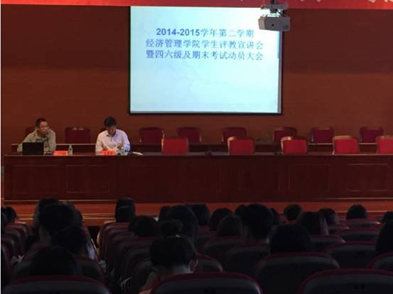 2015年6月12日15时30分kaiyun开云官方网站2014-2015学年第二学期学生评教宣讲会暨四、六级及期末考试动员大会在图书馆四楼博雅讲堂举行,学院书记孔若东、院长助理刘楠、全体专任教师和同学们参加了大会,会议由刘楠老师主持。