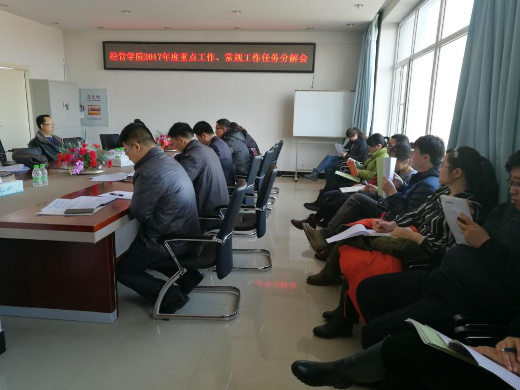会上,首先由办公室主任刘萍逐条宣读了学院各部门2017年度重点工作内容。2017年重点工作包括133项工作,涉及教学、科研、督导与师资、党建、学生管理、办公室、大庆市经济学会、实验实训中心以及市场营销系、财务管理系、旅游管理系12个部门。
