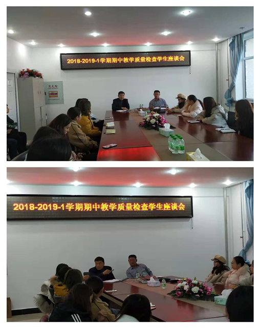 2018年11月28日15:30在第五教学楼402会议室召开2018-2019-1学期期中教学质量检查学生座谈会,学院书记孔若东老师、督导吴俊江老师主持会议,各班级学生代表参加。