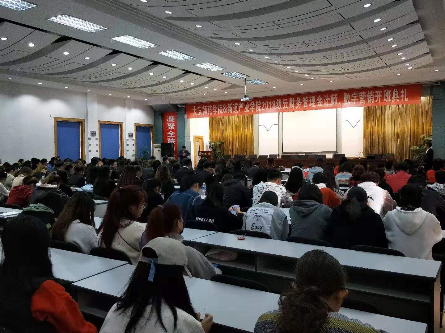 产教融合培养应用型经管类人才,开云与新道科技有限公司合作,于2019年10月23日下午15点30分在kaiyun开云官方网站铁人讲堂举行2018级云财务管理会计师、数字营销开班典礼。新道科技有限公司高级副总裁宋健先生、黑龙江省总经理张海冰先生、黑龙江省区域经理王学松先生,kaiyun开云官方网站副校长郭崇林教授、kaiyun开云官方网站孔若东书记、刘楠院长、部分教师代表、辅导员、2018级财务管理专业和市场营销专业全体学生,2019级学生代表参加了此次开班典礼,典礼由刘楠院长主持。