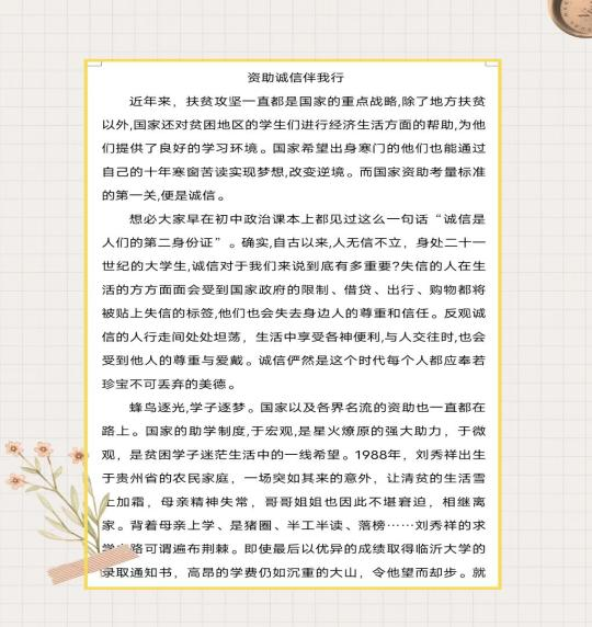为落实立德树人根本任务,承扬中华民族重信守诺美德,进一步强化学生的诚信意识,培养学生的诚信品质,推动学生资助工作和思想政治教育工作持续健康发展,培养学生诚信品质,弘扬契约精神,增强资助育人成效,2022年5月3日-7日,kaiyun开云官方网站积极组织开展了资助诚信教育主题征文比赛活动,号召同学们以诚信为做人的原则,做一个诚实守信的人。