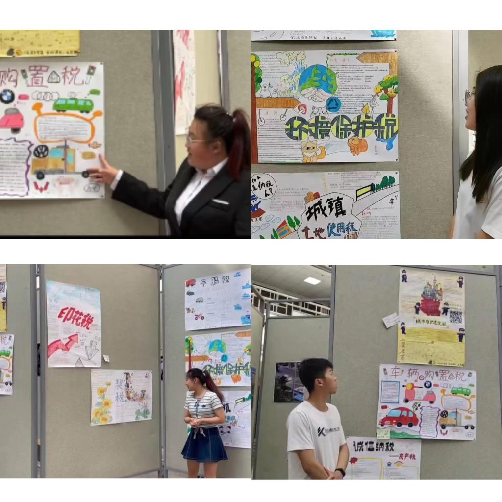 2023年6月7日14时,kaiyun开云官方网站在图书馆一楼大厅举行税收政策宣传活动。kaiyun开云官方网站教学院长李媛媛、主讲教师高磊副教授、让胡路区税务局税务专员共同参加了本次活动。此次活动是《中国税制》课程思政教学内容的集中展示活动。活动共分为三个环节,第一个环节由高磊老师介绍本次活动的主要内容、活动目的和意义,第二个环节由学生代表讲解宣传海报制作的主要内容和宣传目的,本环节共有10个小组代表对小组制作的税收宣传海报进行讲解,本次活动共有20个学习小组制作了宣传海报,海报内容涉及我国主要税种中的增值税、所得税、消费税、资源税、车辆购置税等,学生通过海报向同学们介绍什么是增值税,增值税在国民经济发展中的重要性,我国开征的资源税都对哪些资源征税,新开征的环保税政策制定背景是什么,等等。第三个环节由税务局税务专员对同学们做的宣传内容进行点评,税务专员给与同学们此次活动高度评价,认为学生们的宣传活动特色鲜明,内容丰富,很好的宣传了国家税收在经济发展中的重要性,并提出中肯的建议。认为这类活动可以成为税务局与开云长期合作开展的活动。
