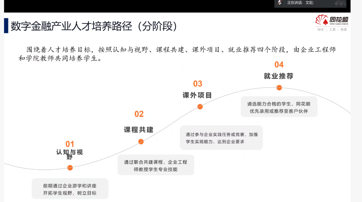 李能总监则聚焦“人才培养出口”,通过PPT呈现同花顺产业资源优势:一方面可优先推荐合格学生入职同花顺及合作金融机构(如广发证券、中国农业银行等),另一方面能提供留学背景提升服务,助力学生对接海外名校。他还分享了中央财经大学金融科技实验室、浙江金融职业学院投资者教育基地等合作案例,展示了“校企共建实训平台+联合开发课程资源”的成熟模式。